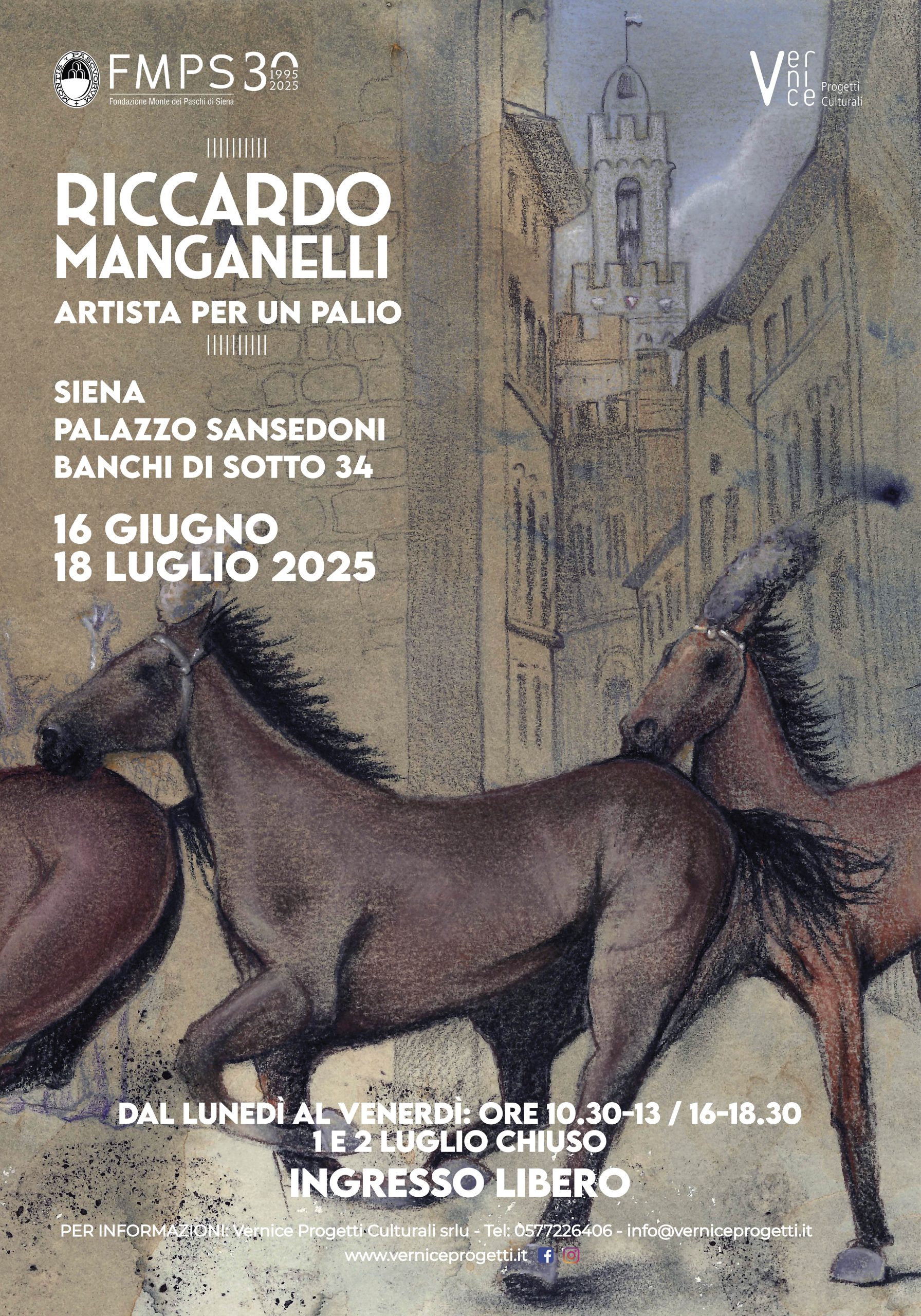 Al centro della mostra personale di Riccardo Manganelli promossa dalla Fondazione Monte dei Paschi di Siena c’è il Palio, non solo come evento, ma come linguaggio, mito e patrimonio collettivo. L’artista rielabora con sensibilità le immagini e le atmosfere della festa più amata dai senesi: i cavalli, le bandiere, le contrade, ma anche il senso di appartenenza e la tensione spirituale che pervade ogni momento del Palio.